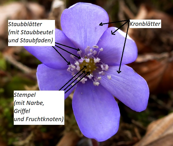 Die Staubblätter setzen sich aus Staubfaden und Staubbeutel zusammen, in welchem der Pollen heranwächst. Könnt ihr euch vorstellen... in diesen zierlichen Staubblättern entstehen noch kleinere Pollen. Diese winzigen Informationspakete werden durch Bienen, Käfer und Schwebfliegen unwissentlich an den Stempel herangebracht. Nach dem Beühren des Pollens an der Narbe des Stempels entwickelt sich ein Polen, im Inneren des Fruchtknotens zu einem Samen. Schließlich entsteht aus diesem Samen wiederum ein neues Pflänzchen. Ist das nicht ein Wunder! So könnte man in einem kühlen Hangwald am Lech länger an einer wunderschönen Blüte eines Leberblümchens verweilen und sich vorstellen wie eine Schwebfliege das Pflänzchen bestäubt, wie der Pollen dabei die untereschiedlichen Stationen durchwandert, sich zum Samen verwandelt und schließlich zu einer Pflanze heranwächst.